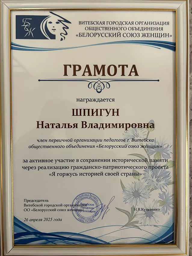 10.10.25г. первично организации педагогов г. Витебска ОО «БСЖ», членом которой является старший преподаватель кафедры Н.В. Шпигун была выдвинута идея о проведение конкурса «Васильковая мадонна» по созданию образа белорусской женщины, которые будут наполнены дородностью, плодородием и женственностью, чтобы от одного взгляда на них веяло теплом и желанием творить. 21.10.25г. данные работы были представлены на выставке в г. Витебске, а затем переданы в головной офис ОО «БСЖ» г. Минск, где состоялась веиколепная встреча с лидером ОО «БСЖ» Республики Беларусь О.А. Шпилевской.
