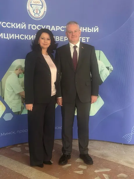 Особой гордостью 2025 года стала успешная защита докторской диссертации доцентом кафедры офтальмологии Оксаной Николаевной Дудич. Звания доктора медицинских наук она была удостоена за её работа по разработке и внедрению персонифицированной системы лечения пациентов с травматическими дефектами глазницы на основе компьютерного моделирования. Результаты данной научной деятельности вносят весомый вклад в практическую медицину, что было отмечено главой нашего государства А.Г. Лукашенко на торжественной церемонии в Дворце Независимости.