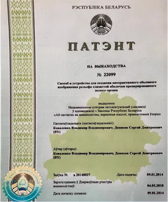 «Способ и устройство для создания интерактивного объемного изображения рельефа слизистой оболочки препарированного полого органа». Официальный бюллетень Национального центра интеллектуальной собственности №4 (123) 2018, с. 56–57. Коваленко В.В., Денисов С.Д.