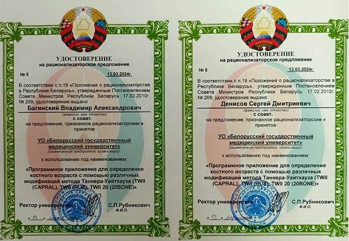 2. Программное приложение для определения костного возраста с помощью метода Таннера-Уайтхауза (TWIII (RUS)). (Удостоверение на рационализаторское предложение №15, дата выдачи 01.11.2023г., авторы: Багинский В.А., Денисов С.Д.).