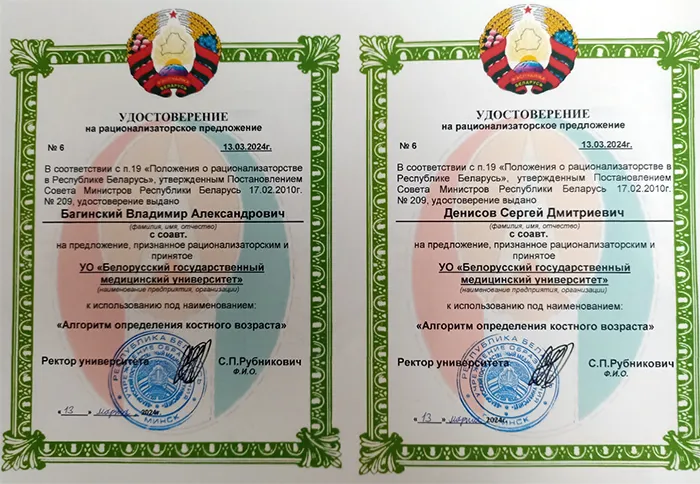 4. Алгоритм определения костного возраста (Удостоверение на рационализаторское предложение №16, дата выдачи 13.03.2024г., авторы: Багинский В.А., Денисов С.Д.).