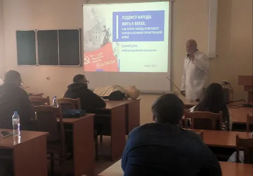 16 апреля 2025 года сотрудники и слушатели кафедры скорой медицинской помощи и медицины катастроф присутствовали на едином дне информирования «Подвигу народа жить в веках. К 80-летию победы советского народа в Великой Отечественной войне». На дне информирования присутствовали 6 сотрудников кафедры, слушатели курса ПК № 352 – 17 человек, слушатели курса ПК № 361 – 12 человек, слушатели курса ПК № 368 – 5 человек. Всего – 42.