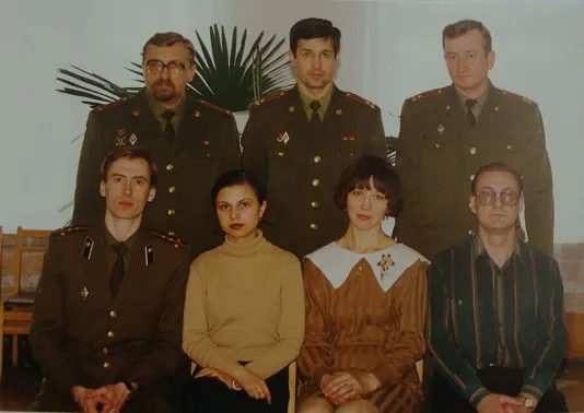 Коллектив кафедры ВПТ 1997г. Слева направо в верхнем ряду: п/п-к м/с Горохов С.С., начальник кафедры п-к м/с Бова А.А., п-к м/с Яблонский В.Н.; в первом ряду: к-н м/с Метельский С.М., Рачковская О.Л., Самусик Л.В., Дуюнов В.М.