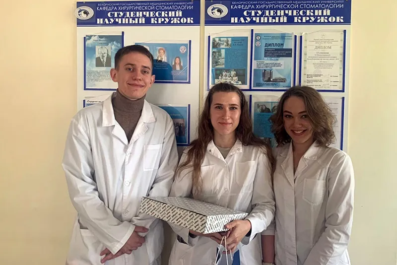 Команда стоматологического факультета учреждения образования «Белорусский государственный медицинский университет» была представлена двумя членами студенческого научного кружка (СНК) им. проф. Б.В. Парина кафедры хирургической стоматологии – студентками 5 курса Алесей Викторовной Гороховой и Ангелиной Константиновной Сычёвой, которые успешно и в срок справились со всеми конкурсными заданиями. Координировал работу участников команды – руководитель СНК – ассистент Александр Олегович Савич.