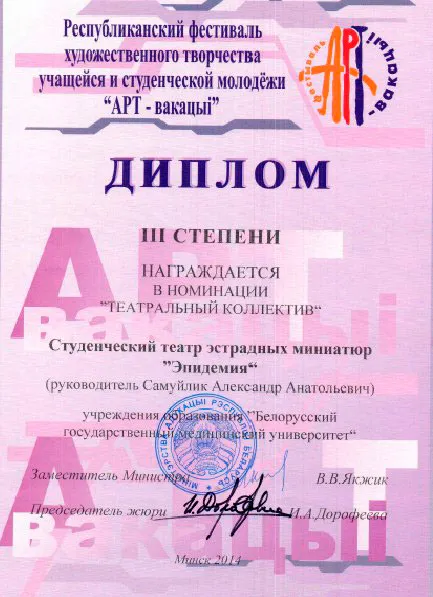 В апреле 2014 года наш коллектив стал лауреатом в фестивале «АРТ-вакация» и был награжден в номинации «Театральный коллектив» дипломом III степени.