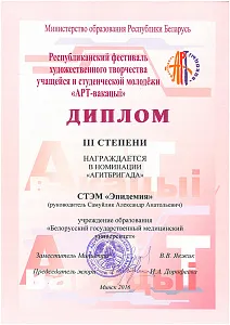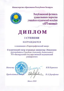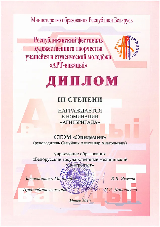 В рамках Республиканского фестиваля творчества учащейся и студенческой молодежи «АРТ-вакацыі» в 2014 года был награжден Дипломом III степени в номинации «Театральный коллектив», в 2016 года Дипломом III степени в номинации «Агитбригада».