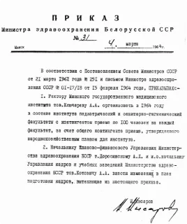 В начале 1964 года Совет Министров БССР принял решение открыть педиатрический факультет при Минском государственном медицинском институте с приемом в 100 человек. Это был лучший подарок I съезду детских врачей Белоруссии, который состоялся 3-5 февраля 1964 года.