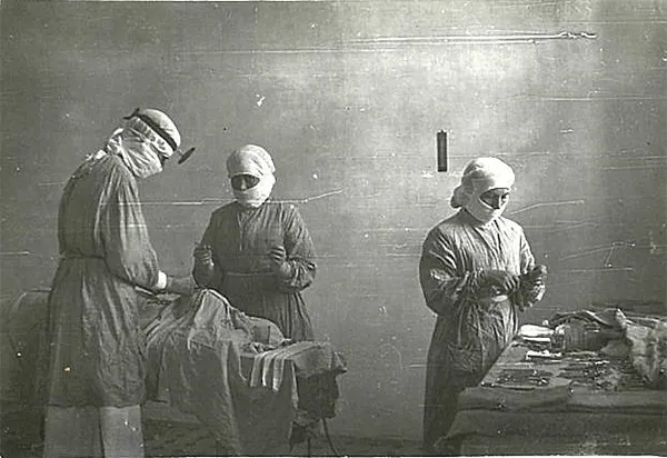 Капитан медицинской службы Соснин Г.П. в операционной военного госпиталя.