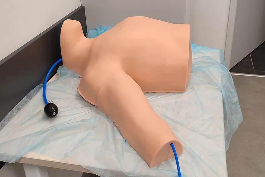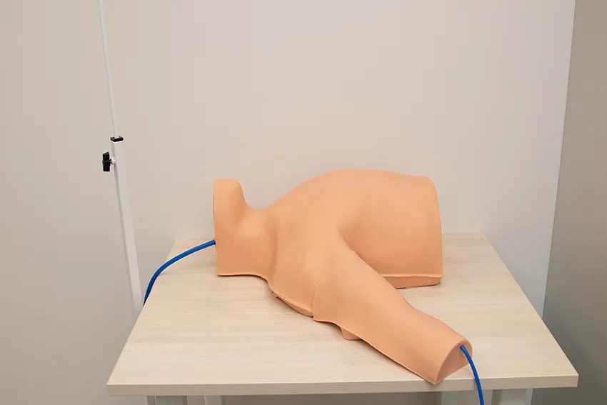 Тренажер представляет собой анатомически верную модель верхнего отдела торса с пальпируемыми анатомическими ориентирами, которые включают грудинную выемку, грудино-ключично-сосцевидную область, ключицу, и предназначен для отработки катетеризации центральных вен и сердца, а также парентерального ввода жидкостей, измерения центрального венозного давления, наложения повязок без риска инфицирования и иных осложнений у пациента.